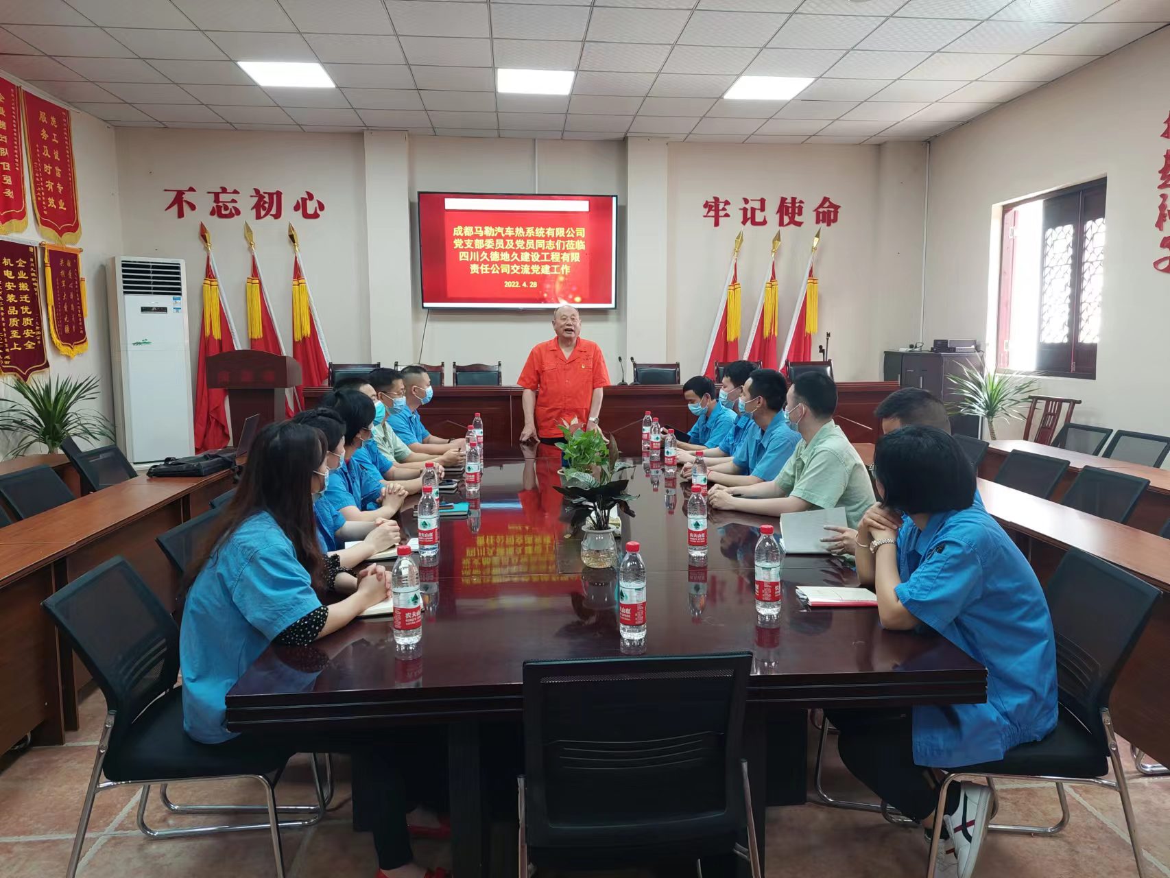 2022年4月28日,成都馬勒汽車熱系統(tǒng)有限公司黨支部書記李琴同志帶領(lǐng)支部委員、共產(chǎn)黨員一行走進(jìn)四川久德地久建設(shè)工程有限責(zé)任公司,雙方聯(lián)合開展了黨日活動。四川久德地久黨支部書記吳貢學(xué)同志作了黨史專題輔導(dǎo),并作了“如何發(fā)揮黨員先進(jìn)模范作用”的經(jīng)驗介紹。